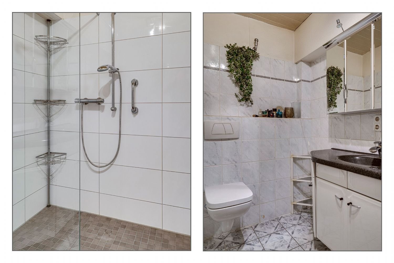 - Badezimmer mit ebenerdiger Dusche, WC und Waschtisch