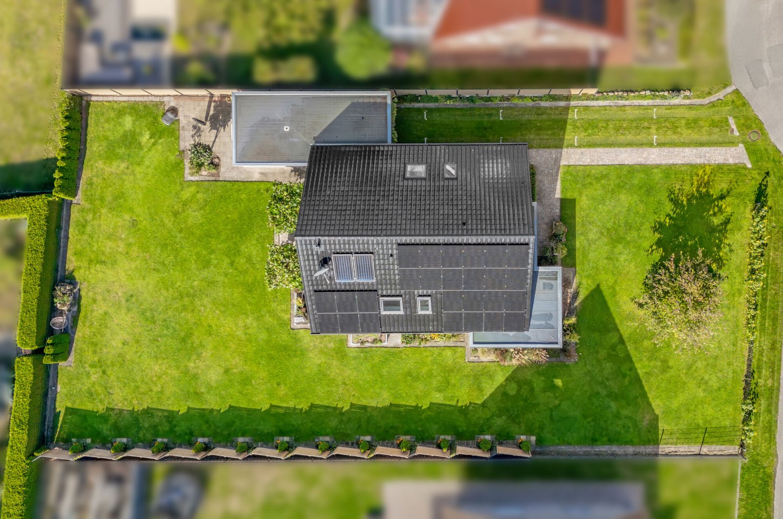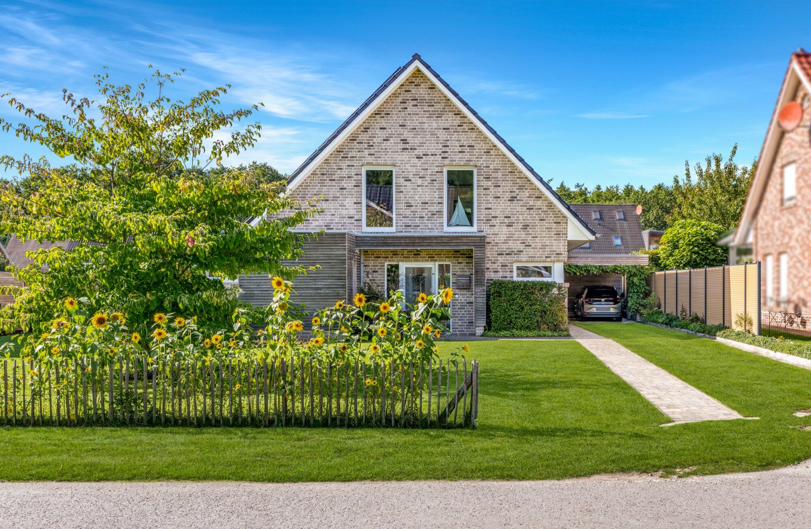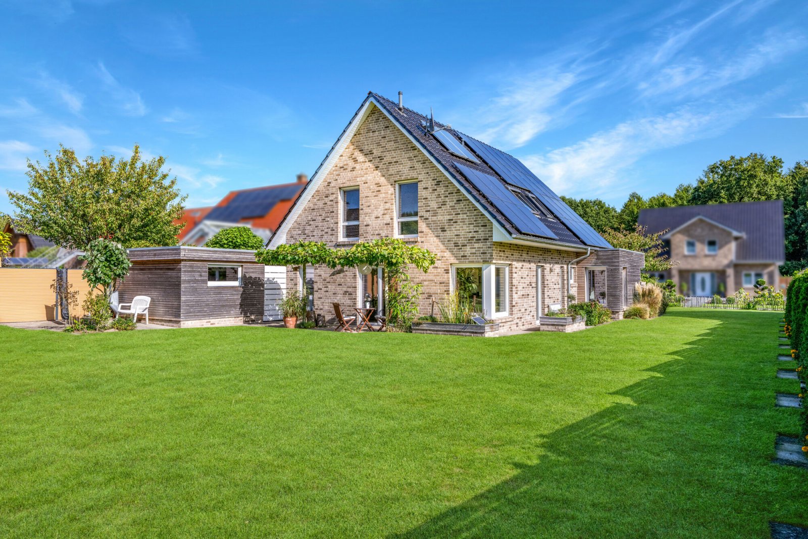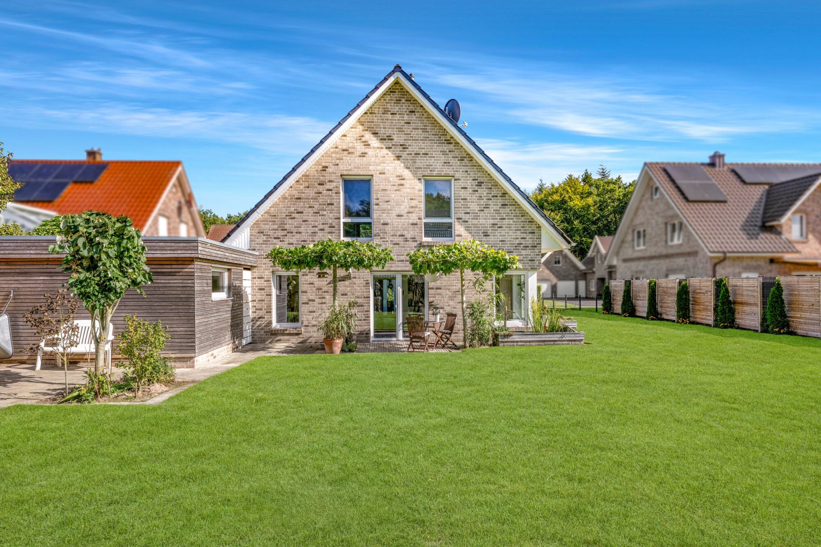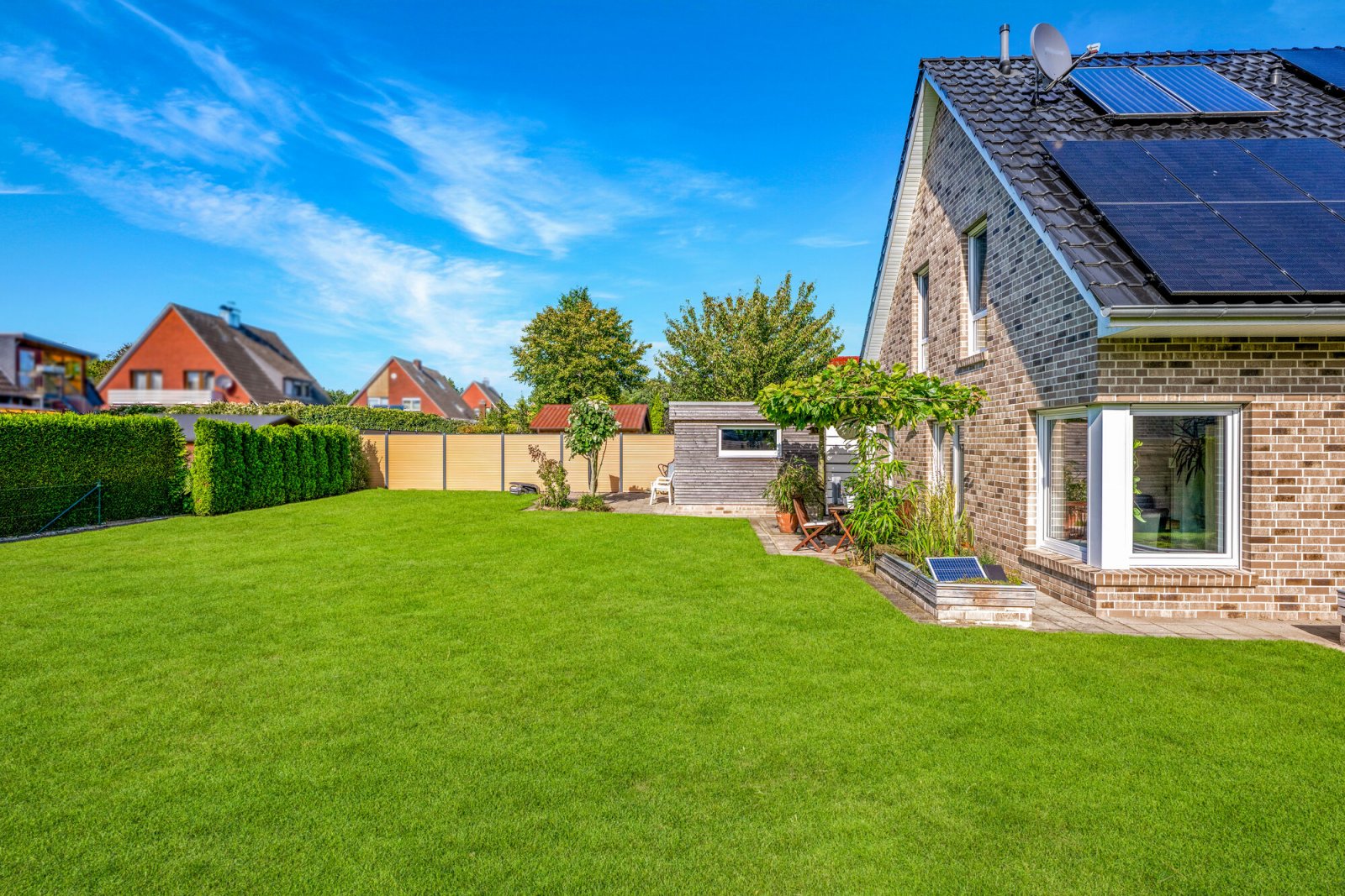 Das Grundstück ist eingefriedet und mit Sichtschutzelementen ausgestattet. Der Carport in Lärchenholzrahmenbauweise verfügt über einen angrenzenden Geräteraum und einen Zugang zum Garten.