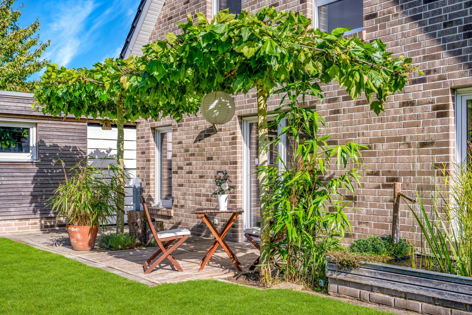 Der Garten ist liebevoll angelegt und umfasst sowohl den Vorder- als auch den rückwärtigen Grundstücksbereich. Die Terrasse ist mit einem Belag aus Akazienholz versehen und wird teilweise durch eine natürliche Begrünung überdacht. Ein kleiner Fischteich, Hochbeete, moderne Pflanzflächen sowie eine automatische Bewässerungsanlage mit Feuchtesensor sorgen für ein stimmiges Gesamtbild. Ein GPS-gesteuerter Rasenmähroboter, der im Kaufpreis enthalten ist, unterstützt zusätzlich bei der regelmäßigen Pflege der Rasenflächen.