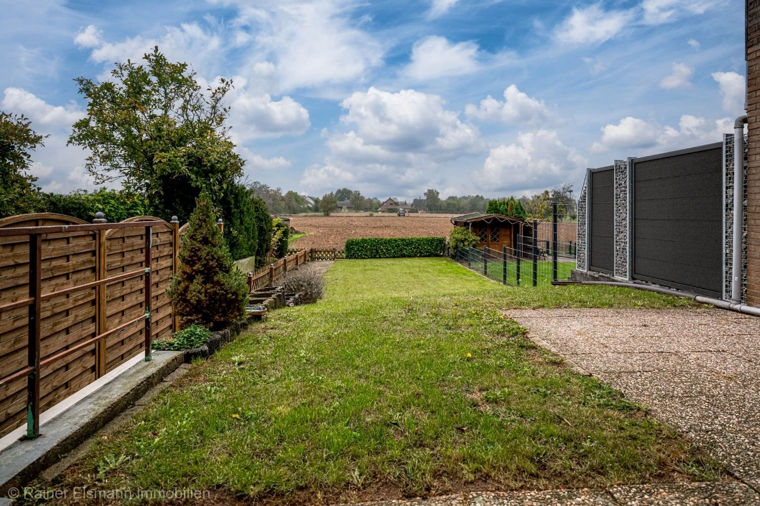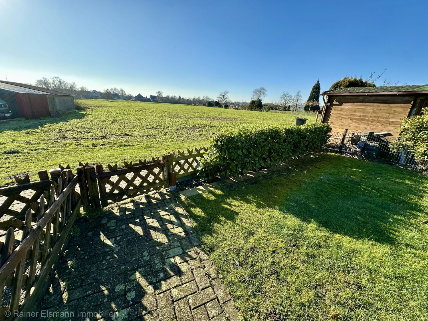 Der eingezäunte Garten bietet einen fantastischen, freien Blick auf Felder und lädt mit seiner erhöhten Terrasse zum Verweilen ein. Die Südausrichtung sorgt für optimale Lichtverhältnisse und ganztägigen Sonnenschein. Der Garten ist pflegeleicht angelegt.