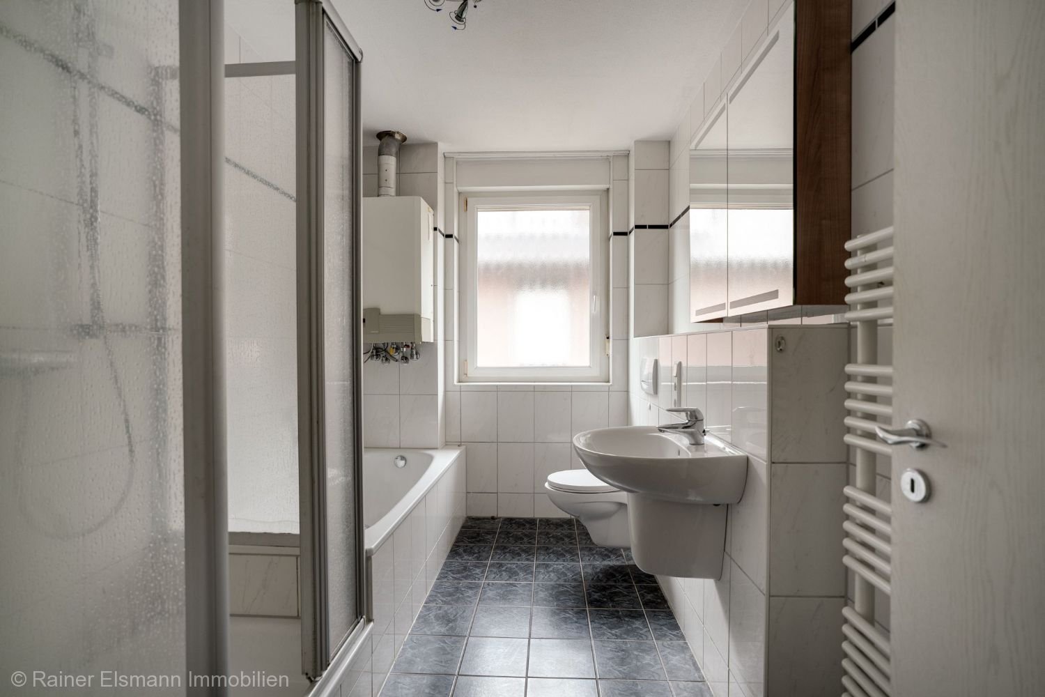 Badezimmer im Stile des Baujahres mit Dusche, Badewanne, WC und Waschtischanlage – Standort Heizung