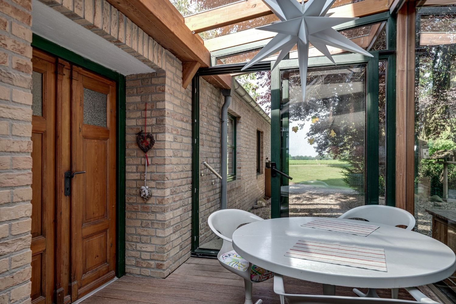 2 Schlafzimmer, Flur mit Zugang zum OG, Badezimmer mit Dusche, Wohnzimmer mit Kamin, Zugang zum Wintergarten und Café
