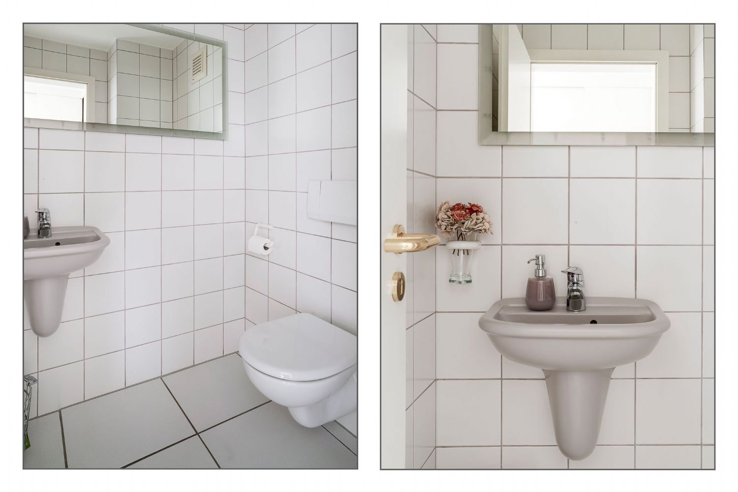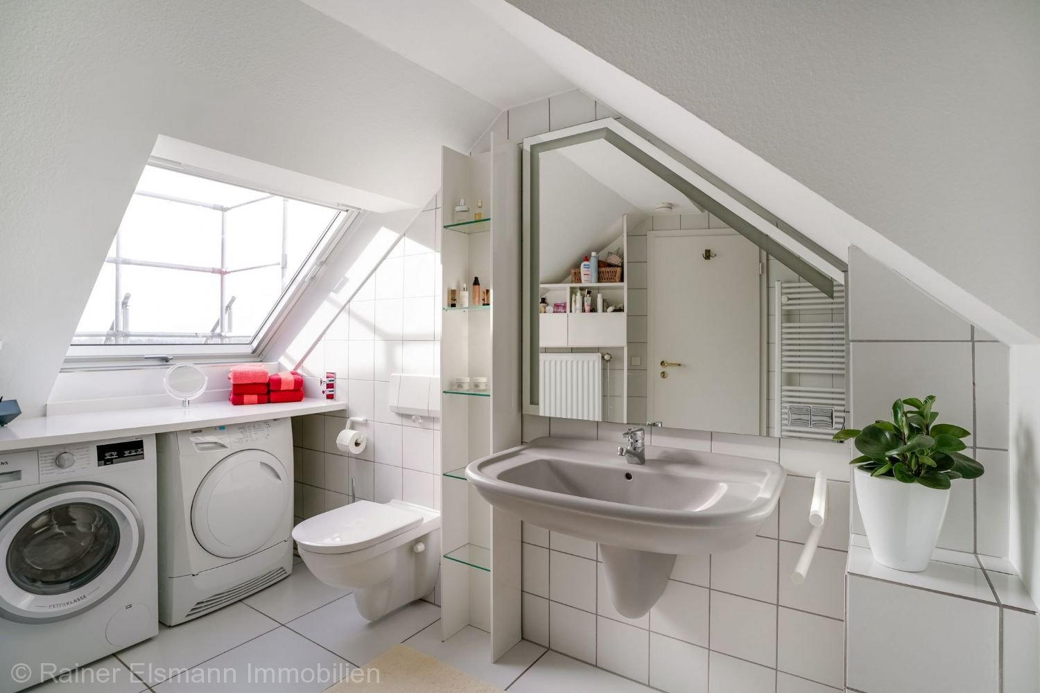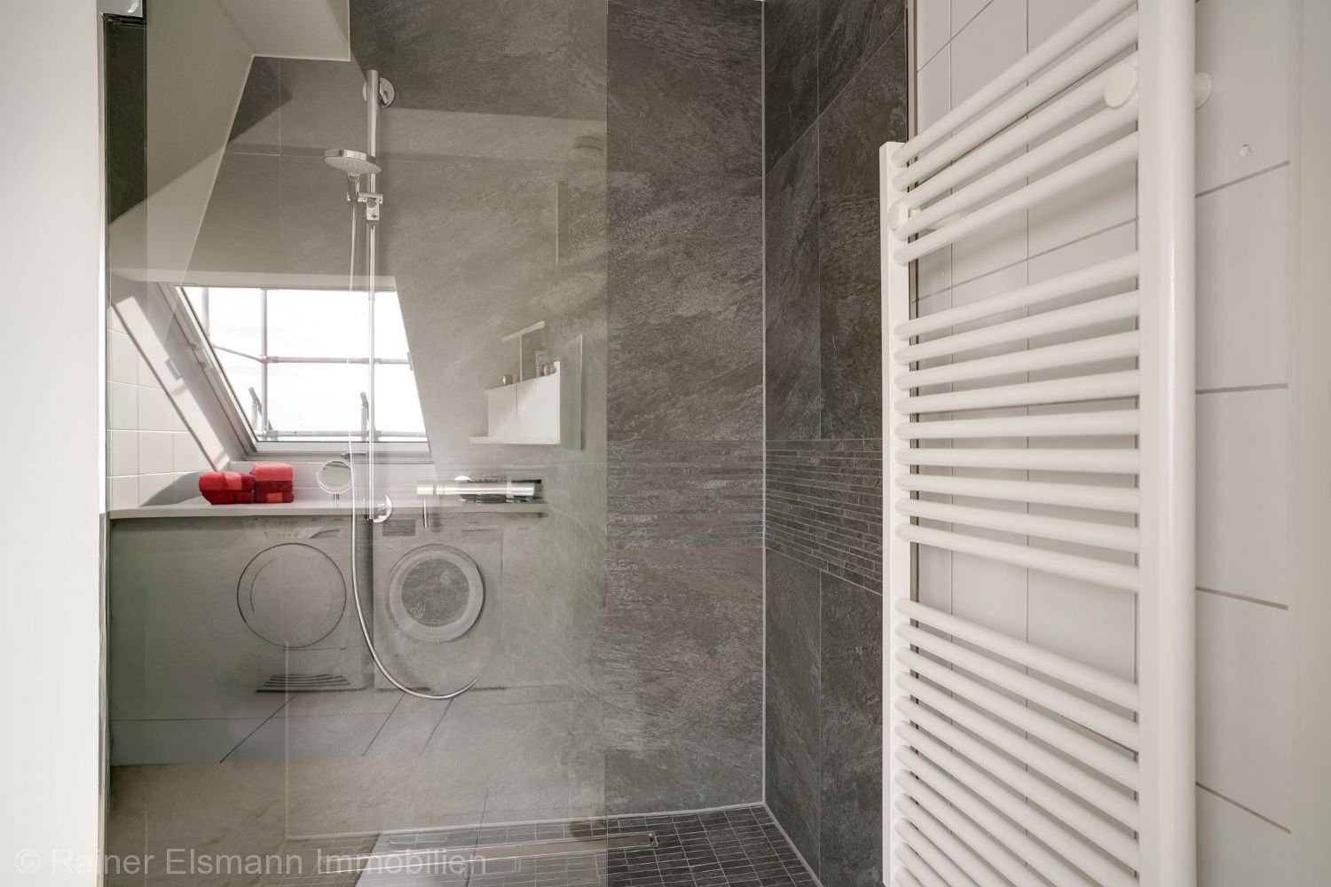 Sowohl das Gäste-WC als auch das Badezimmer sind in einem schlichten Weiß-Grau gehalten. Das Badezimmer verfügt über eine großzügige Dusche (2023 erneuert), ein WC und eine moderne Waschtischanlage. Die Waschmaschine und der Trockner sind aktuell im Badezimmer untergebracht, um den Weg in den Keller zu ersparen.