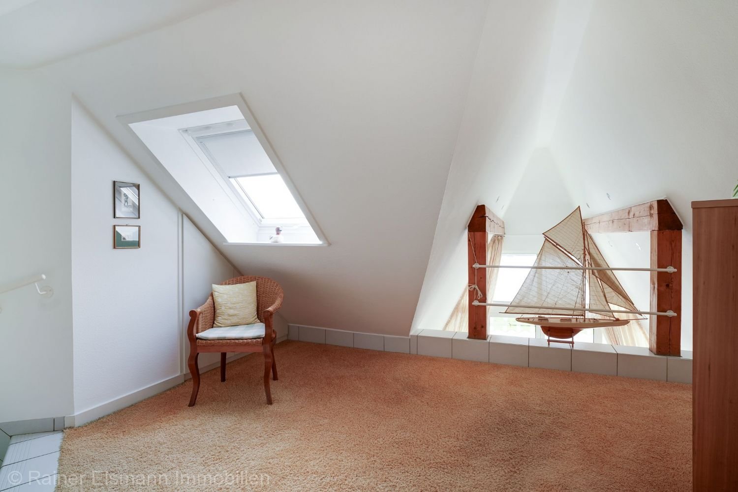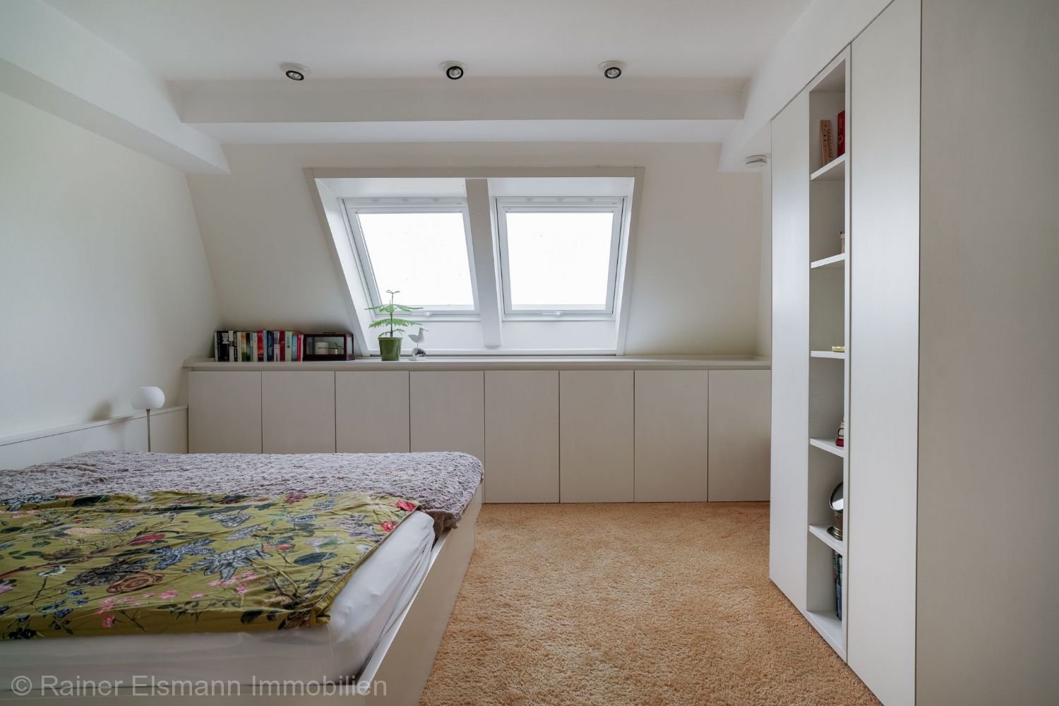 Das helle und freundliche Schlafzimmer rundet das Wohnkonzept ab. Dank der Einbauschränke bietet es viel Stauraum und Komfort – perfekt für ruhige Nächte und entspannte Morgen. Die offene Empore eignet sich hervorragend als Arbeitsplatz und verfügt über ein Klimagerät.