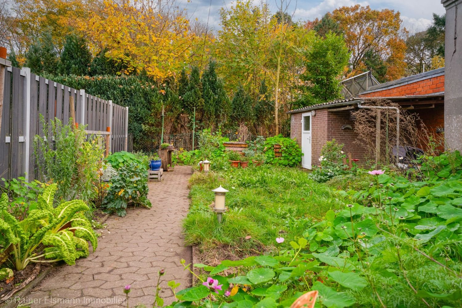 Der Garten besticht durch eine naturbelassene Gestaltung, die viel Platz für Gemüse- und Kräuterbeete bietet. In dem massiven Gartenhaus finden Fahrräder, Gartengeräte und weiteres Zubehör ausreichend Platz, und eine Grundwasserpumpe versorgt zuverlässig die Bewässerung des Gartens. Der Zugang erfolgt flexibel über das Haus oder den rückwärtigen Weg, der durch ein eingetragenes Wegerecht gesichert ist.