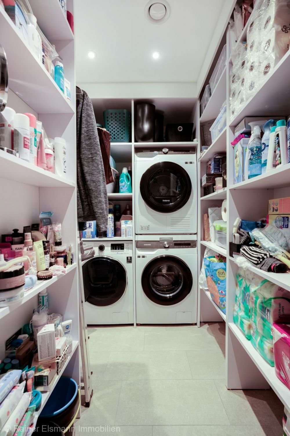 Der Raum ist ausgestattet mit angefertigten Einbauschränken, passenden für Waschmaschine und Trockner.