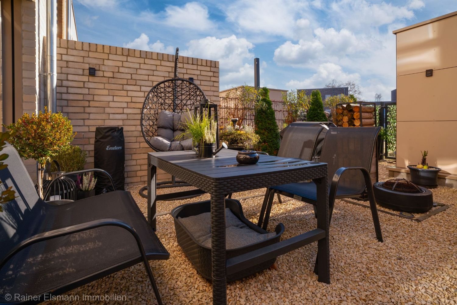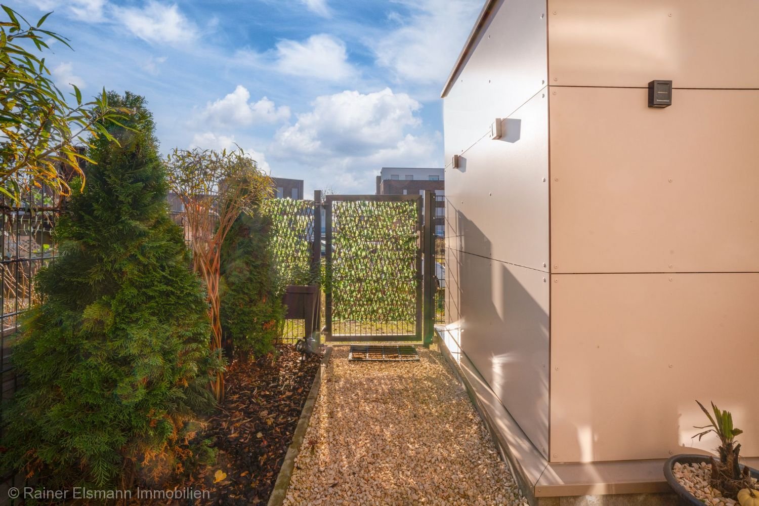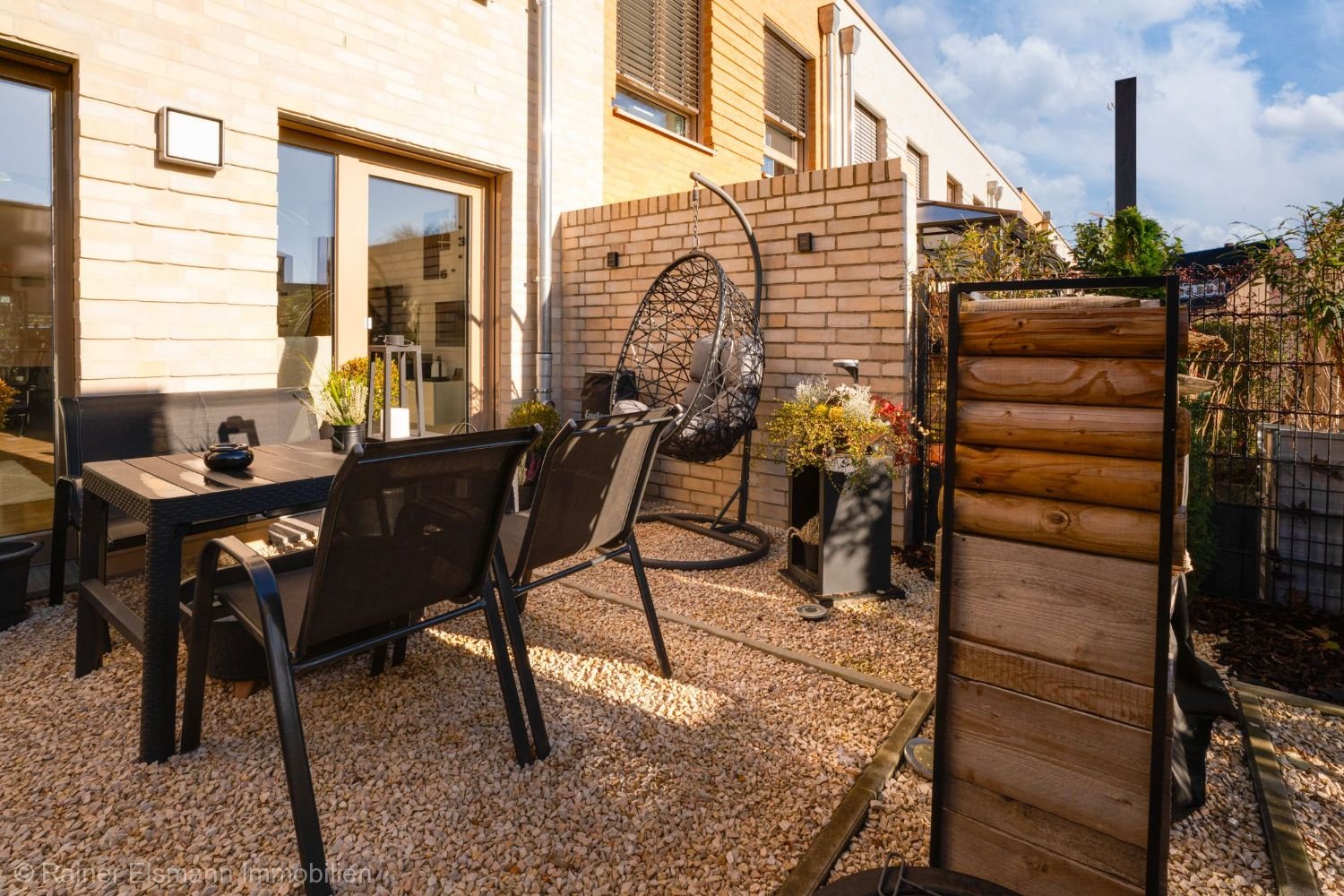 Das Grundstück ist pflegeleicht angelegt. Der Vorgarten ist gepflastert und verfügt über einen Stellplatz sowie eine Abstellmöglichkeit für Mülltonnen. Hinter dem Haus befindet sich die Terrasse mit Abstellraum. Der Bereich ist eingefriedet und durch eine Mauer vom Nachbarn getrennt.